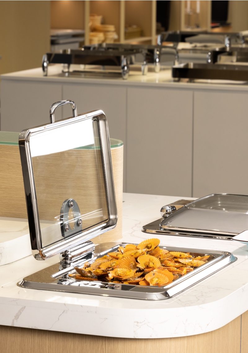يضمن إطار 304 من الفولاذ المقاوم للصدأ والتشطيب المصقول المرآة طول العمر ، في حين أن الزجاج المتشدد يتيح مراقبة الطعام دون إزالة الغطاء.