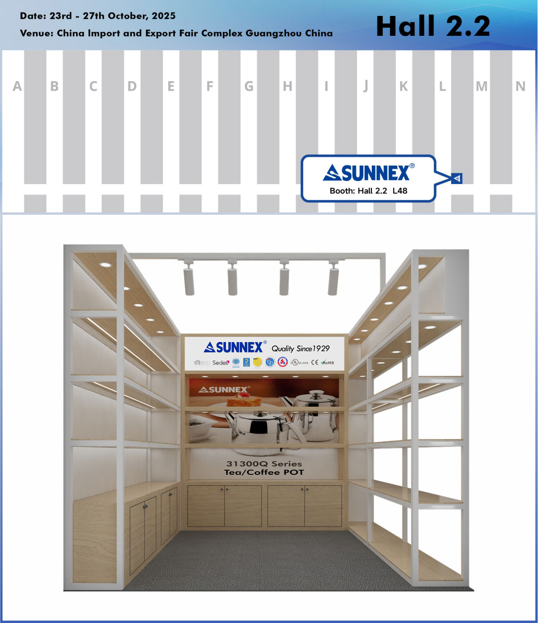 قوانغتشو، الصين - أكتوبر 2025 - يسر شركة SUNNEX Century (Shenzhen) Ltd.، الشركة الرائدة في تصنيع أدوات البوفيه المتميزة وأطباق الطعام وموزعات المشروبات والأدوات المنزلية، دعوة المشترين الدوليين ووسائل الإعلام ومتخصصي الصناعة لزيارة أكشاكنا في معرض الاستيراد والتصدير الصيني الـ 138 (معرض كانتون).